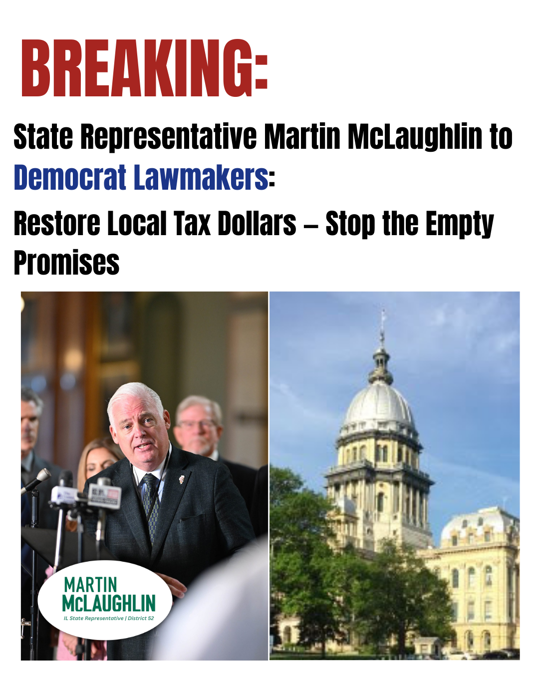 ILLINOIS – State Representative Martin McLaughlin (R–52nd District) is calling on Illinois Democrats to immediately restore the local share of tax receipts to the full 10 percent required by state policy.
