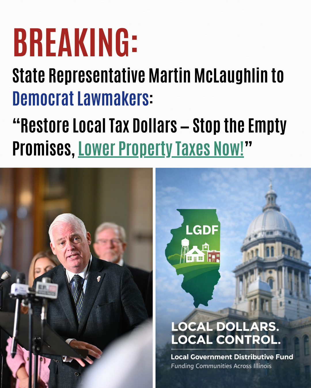 ILLINOIS – State Representative Martin McLaughlin (R–52nd District) is calling on Illinois Democrats to immediately restore the local share of tax receipts to the full 10 percent required by state…